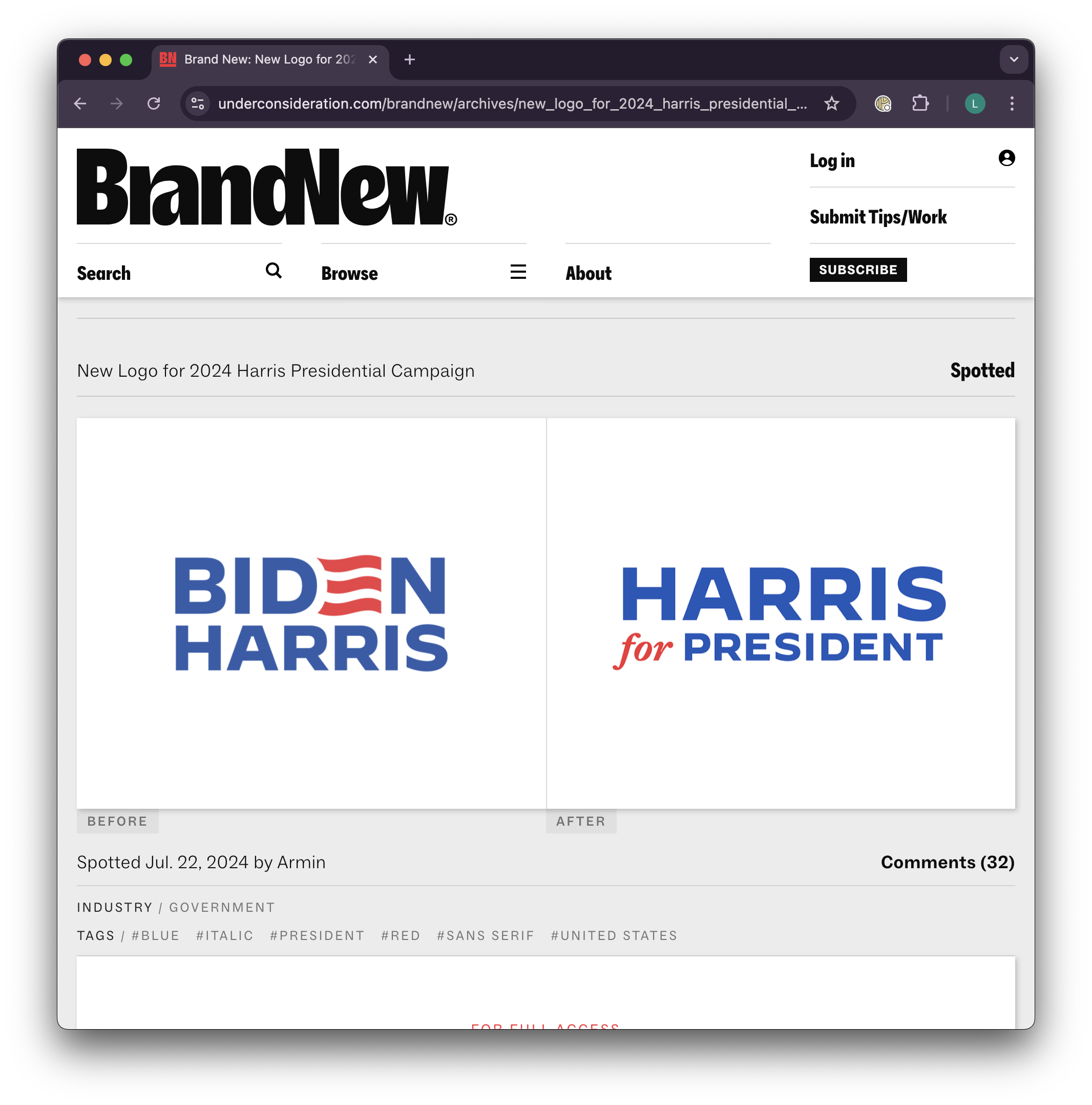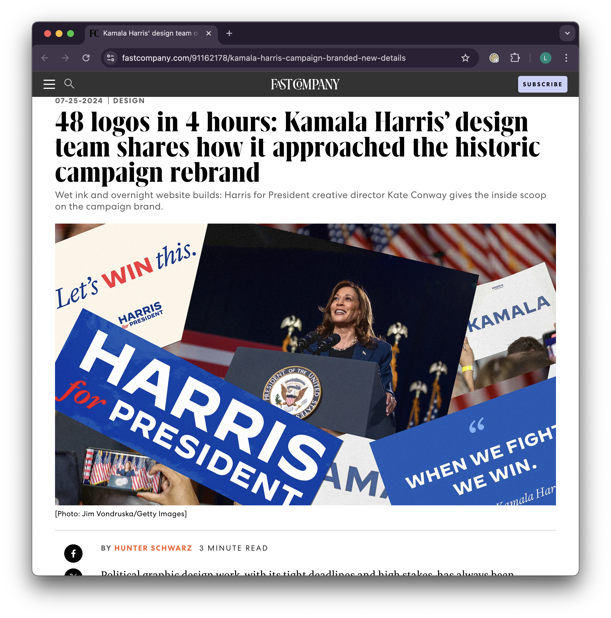 As a Senior Designer on the historic 108-day Harris for President campaign, I did everything from brand development to event signage to advertising concepting and bus wraps. While we did not achieve the electoral outcome we were hoping for, we did raise the bar for what can be accomplished by a small team of designers in a very short span of time. Below are just some of the many designs I created for the campaign, beginning with a new logo for an overnight brand flip.