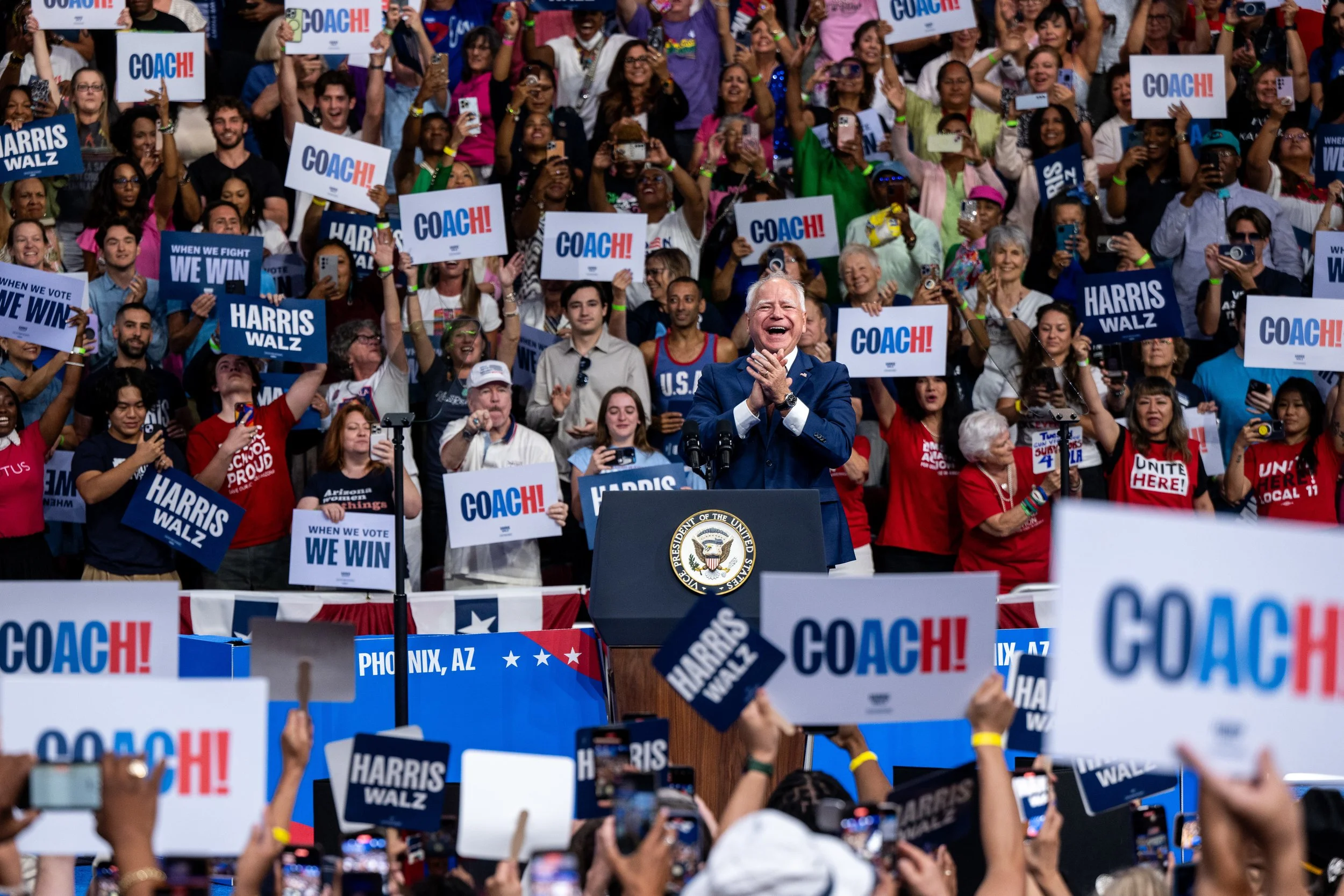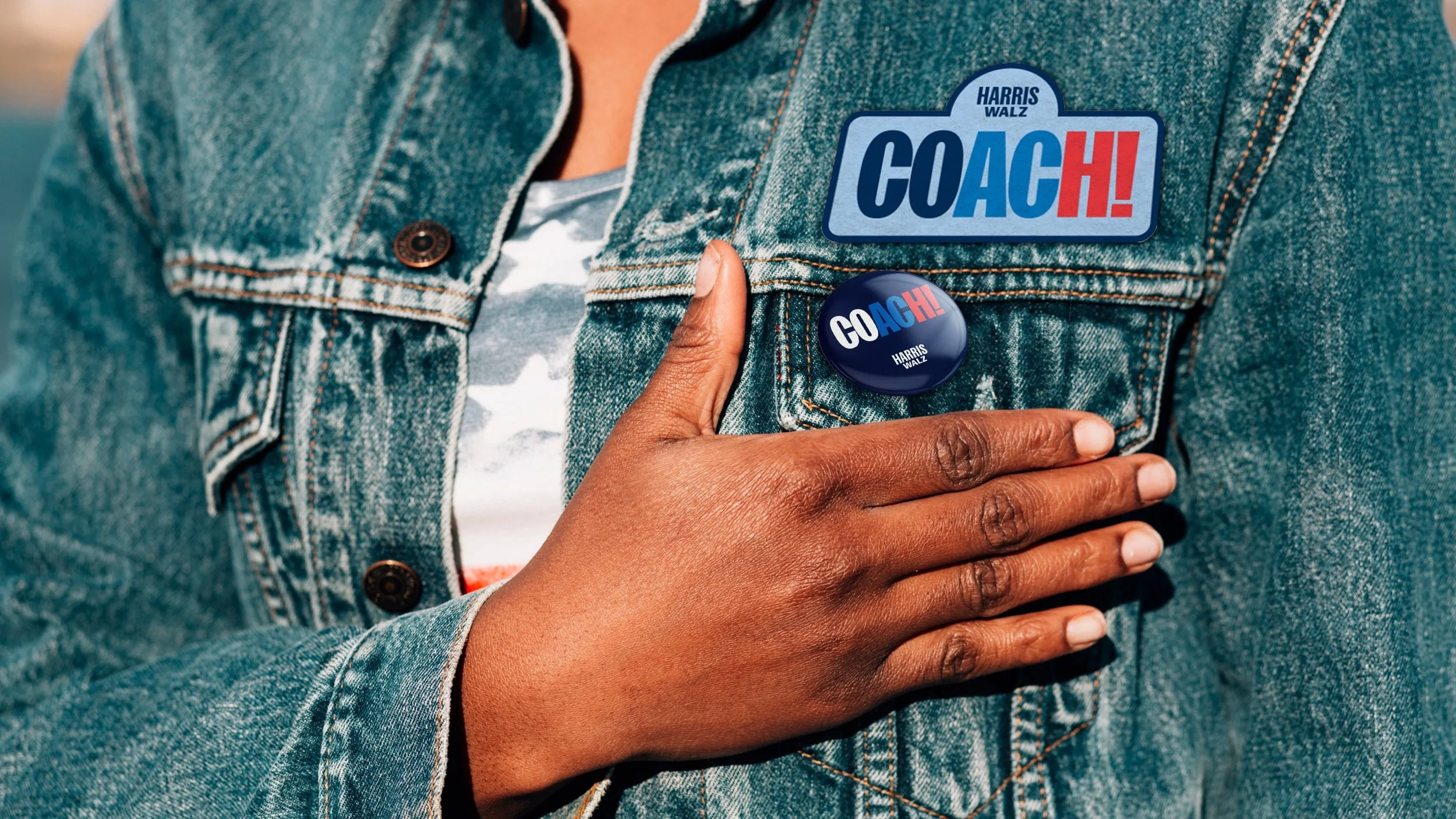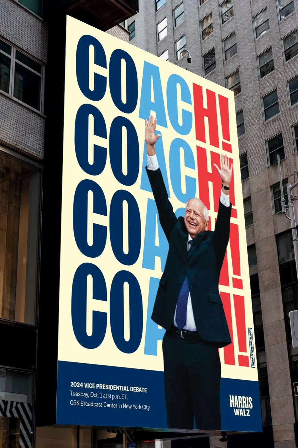Governor Walz brought an immediate spark to the campaign, and I collaborated with my colleague, September Broadhead, to design a sub-brand with that same level of energy. The COACH! logotype reflected the Governor’s personality and the placards encouraged a COACH! chant at rallies. I then extended the brand with a line of COACH! merchandise and debate advertising.