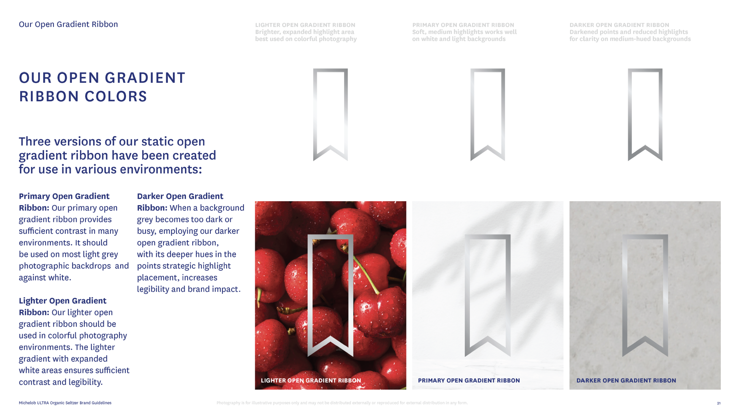 Sometimes the process of creating guidelines reveals complications with a brand. For Michelob Ultra Seltzer, it was the gray ribbon color which was getting lost on background photography.